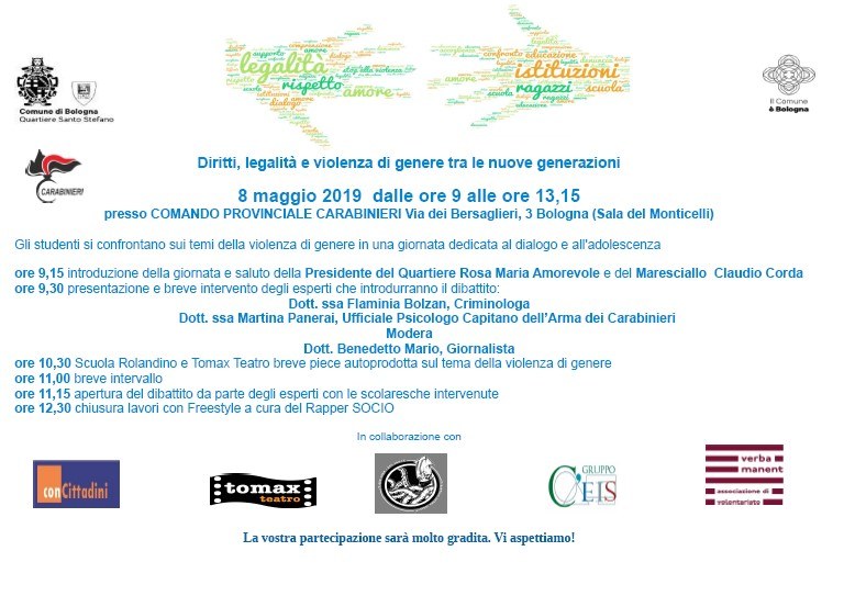 - la giornata conclusiva del progetto è in programma l'8 maggio 2019 con tutti gli Istituti comprensivi e le scuole secondarie di secondo grado del Territorio, il Consiglio di Quartiere Ragazzi, lo "Spazio giovani" Dipartimento Cure primarie Ausl di Bologna ed Associazioni che svolgono con i ragazzi le attività - per l'anno in corso sulla violenza di genere;