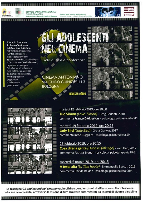 - rassegna cinematografica cittadina dal titolo GLI ADOLESCENTI NEL CINEMA nel periodo di febbraio/Marzo 2019 presso il cinema Antoniano;