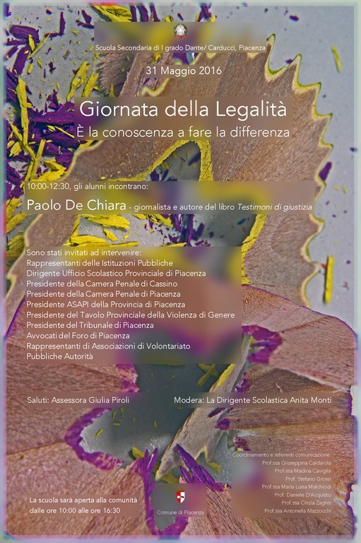 La SS Sec. di 1° grado D.Alighieri - G. Carducci di Piacenza realizza il progetto La scuola della Legalità in rete con: Comune di Piacenza, Provincia di Piacenza, associazioni del Tavolo permanente provinciale contro la violenza di genere.