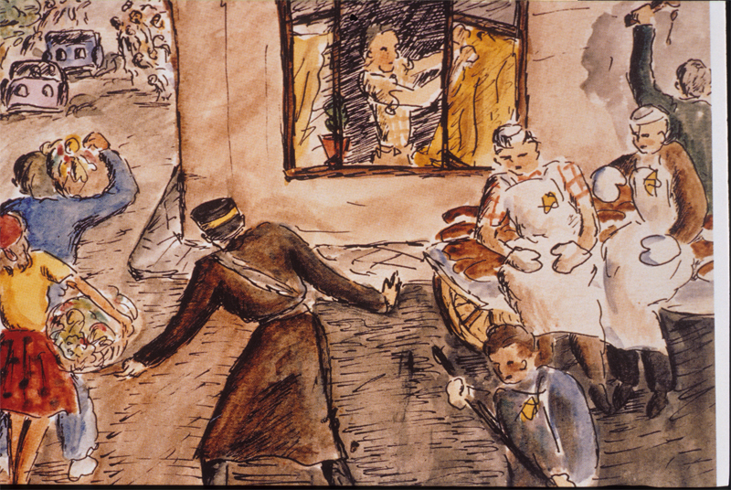 Terezín, preparativi per la visita della Commissione della Croce Rossa internazionale. Disegno realizzato nel 1944, dalla dodicenne Helga Weissova