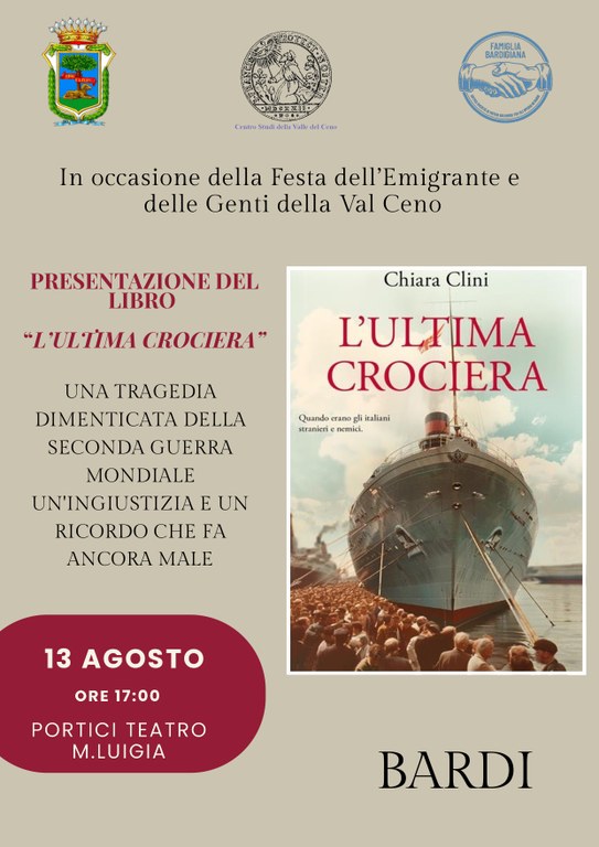 Il programma prevede oltre alla presentazione del libro "L'ultimo crociera" di Chiara Clini alle ore 17:00 (IT), anche una Cena in piazza alle ore 19:00, a seguire ballo liscio e la tradizionale sfida dell’albero della cuccagna.