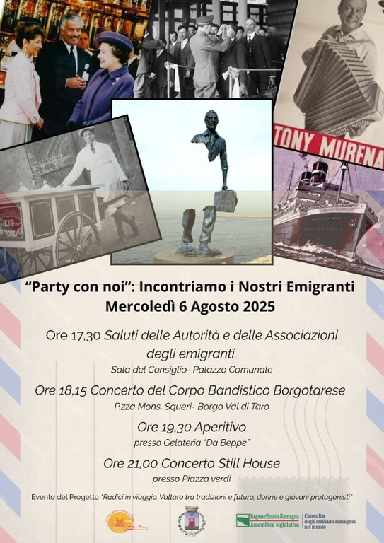 All'interno del progetto "Radici in viaggio. Valtaro tra tradizioni e futuro, donne e giovani protagonisti" coordinato dal Comune di Borgo Val di Taro (PR) con il contributo della Consulta, il prossimo 6 agosto 2025 verrà organizzato l'evento " Party con noi: incontriamo i nostri emigrati".