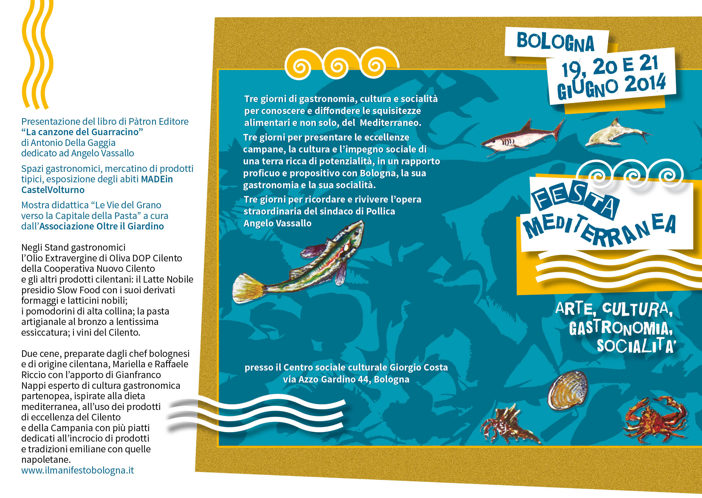 La “Festa mediterranea”, è stata promossa, insieme con altre associazioni del territorio regionale, dal comitato di gemellaggio Bologna-Pollica, sorto per valorizzare la figura di Angelo Vassallo il “Sindaco pescatore” di Pollica nel Cilento, brutalmente ucciso il 5 settembre 2010 da mano camorrista ancora ignota, nonostante i forti indizi e il fatto che fosse ben noto il suo impegno per il buon governo, la legalità e il contrasto all’economia criminale.